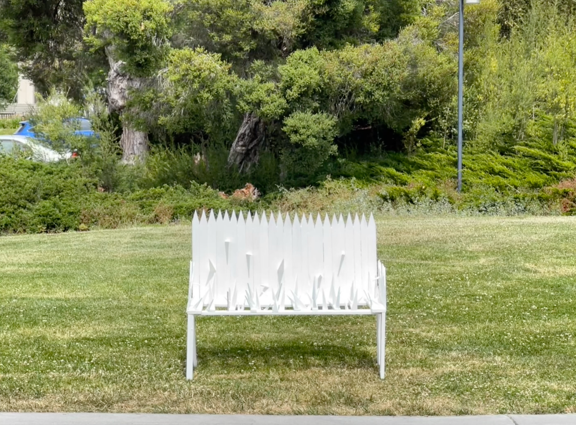 This sculpture was built from discarded floorboards. Assembled into the shape of a bench, which has the appearance of a white picket fence. This. was to call on the expression and phenomena of NYMBism (Not In My Backyard), featuring exaggeratedly spiked beams that line the back of the bench as well as throughout what should be the seat of the bench. This is a reference to hostile architecture and the way that it targets houseless individuals and keeps them from basic human comforts. This happens constantly in front of our eyes, but sometimes it is hard to see for those of us who do not interact with the world in the same way. This sculpture was installed publicly on the UC Berkeley campus. The artist documented the interactions, or lack thereof. This is significant because just like pieces of hostile architecture or houseless people themselves, people ignore what is difficult, uncomfortable, or inconvenient.